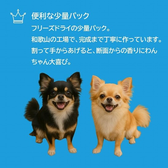 愛犬の健康を第一に考えた100%天然素材のフリーズドライおやつをご紹介します。和歌山県の国内工場で丁寧に製造された、安心・安全な鶏むね肉のドッグフードです。フリーズドライ製法により、素材本来の栄養価と風味を最大限に保持しています。適度なサイズにカットされた鶏むね肉は、愛犬が食べやすく、おやつやトッピングとして最適です。保存料や添加物を一切使用していないため、アレルギーを気にされる飼い主様にも安心してお与えいただけます。パッケージは使いやすいチャック付きの袋で、鮮度を保ちながら便利に保存できます。愛犬とのコミュニケーションやトレーニング時の褒美として、また普段のごはんのトッピングとしてもおすすめです。国産原料にこだわり、安全性を重視した製造工程で、愛犬に安心して与えられる高品質なおやつに仕上げました。