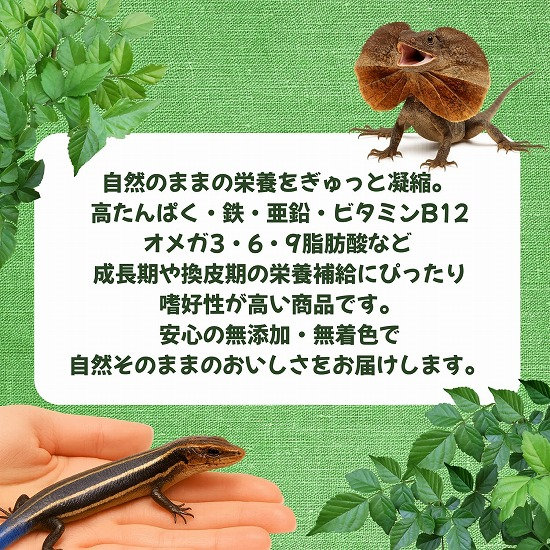 | 使用方法 | 大型の爬虫類や小動物でしたら、乾燥したそのままを与えて問題ありません。少量の水に浸して柔らかくすると嗜好性が向上します。爬虫類の場合はピンセット給仕が有効です。 |